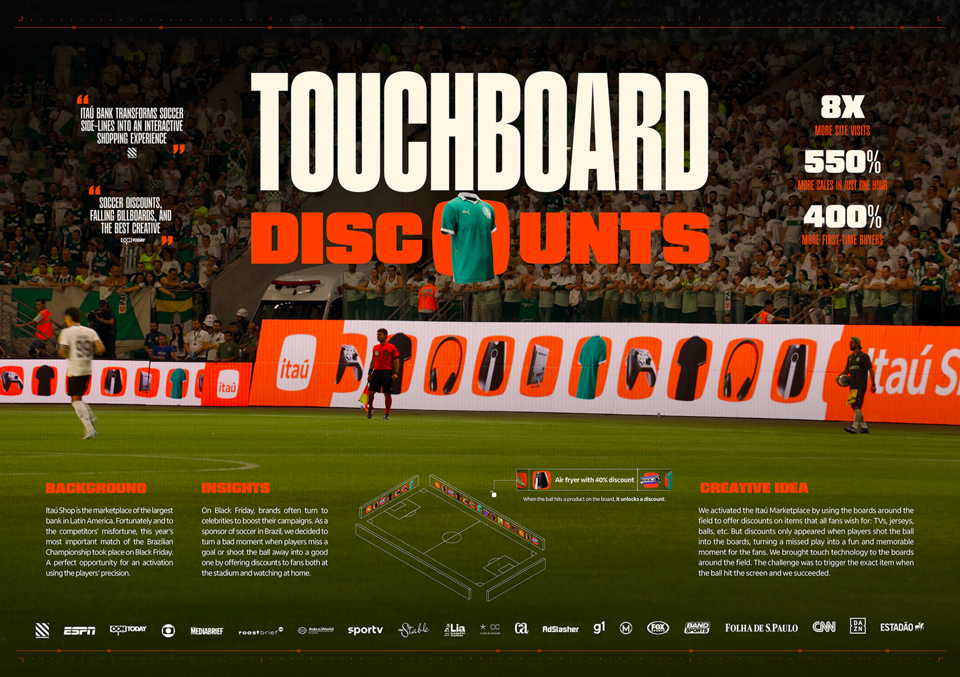 On Black Friday, we turned missed goals into real-time discounts. Using touch-sensitive boards around the field, every off-target shot unlocked Itaú Shop offers for fans at the stadium and at home, turning frustration into celebration.